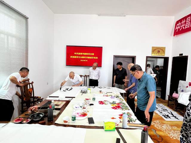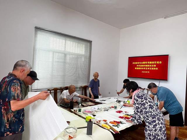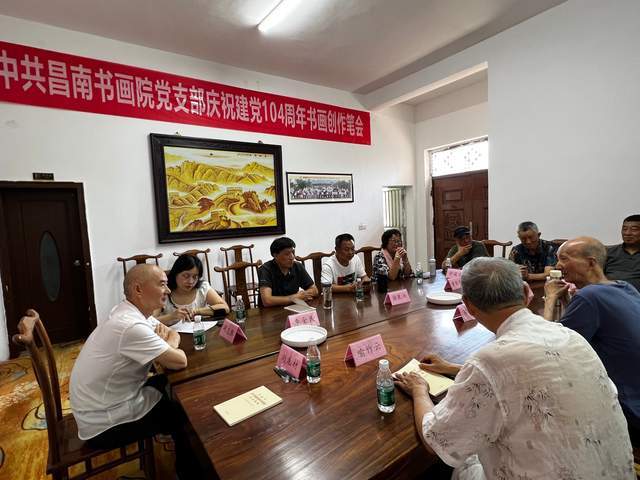 为热烈庆祝中国共产党成立104周年,弘扬中华优秀传统文化,传承红色基因,7月2日上午,中共昌南书画院党支部举办“翰墨丹青颂党恩”主题书画创作笔会活动。支部党员及书画艺术家邹祖贵、胡忠胜、刘龙材、喻作云、姜渭乐、李金民、操民兴、徐国庆、刘圣国、曹黎凤、金国昌等参加活动,以笔墨抒怀,用艺术献礼党的生日。