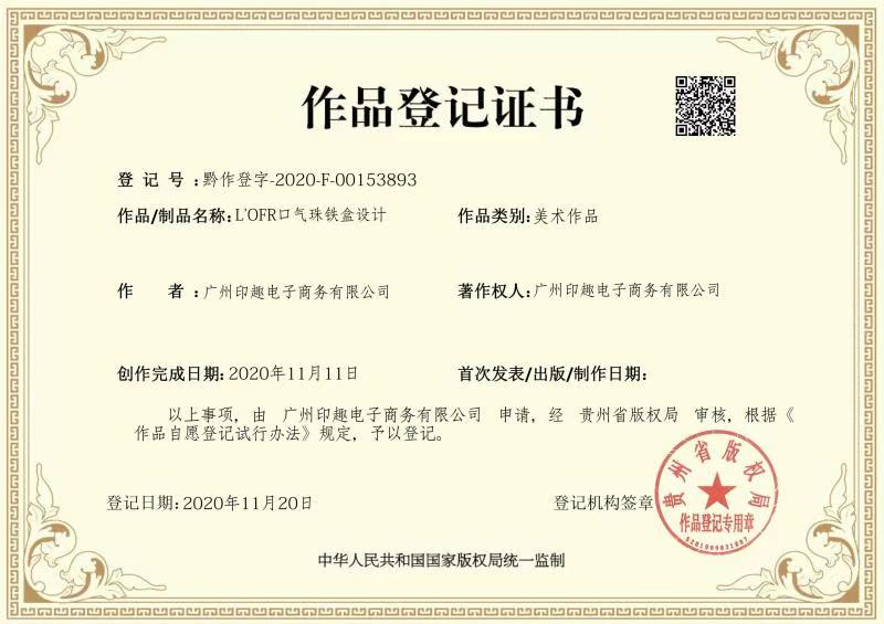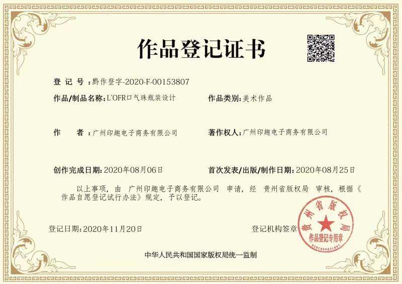 登记号:黔作登字-2020-F-00153807,作品名称:LOFR罗伊氏乳杆菌爆珠接吻糖瓶装设计,作者为:广州印趣电子商务有限公司。首次完成创作时间为:2020年8月6日,首次公开发表地点及时间为:广东省广州市2020年8月25日。并于...