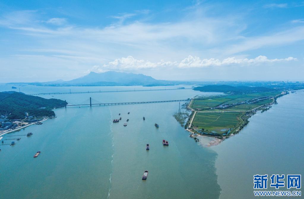鄱阳湖汇入长江口的全景。新华网发(江西省港口集团供图)