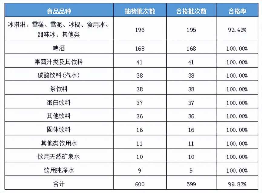 本次专项抽检覆盖了百事可乐、可口可乐、宏宝莱、光明等32家地产食品生产企业和全市范围内150家商超、小食杂店、冷饮店等经营场所,抽检了康师傅、美汁源、光明、冰雪怪、钟薛高等地产产品,以及雪花、哈尔滨、科罗娜、怡宝、燃茶、阿萨姆、奥雪、东北大板、中街、甄稀等市面常见热销的200多个品牌的冷冻饮品、饮料、酒类(啤酒)等3大类食品,共抽检600批次,总体合格率99.83%。