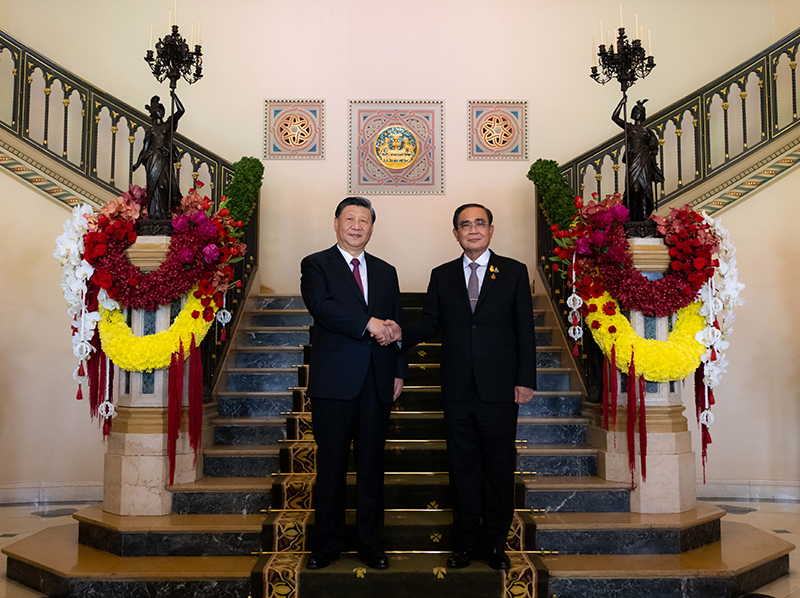 当地时间11月19日中午,国家主席习近平在曼谷总理府同泰国总理巴育举行会谈。新华社记者 翟健岚 摄