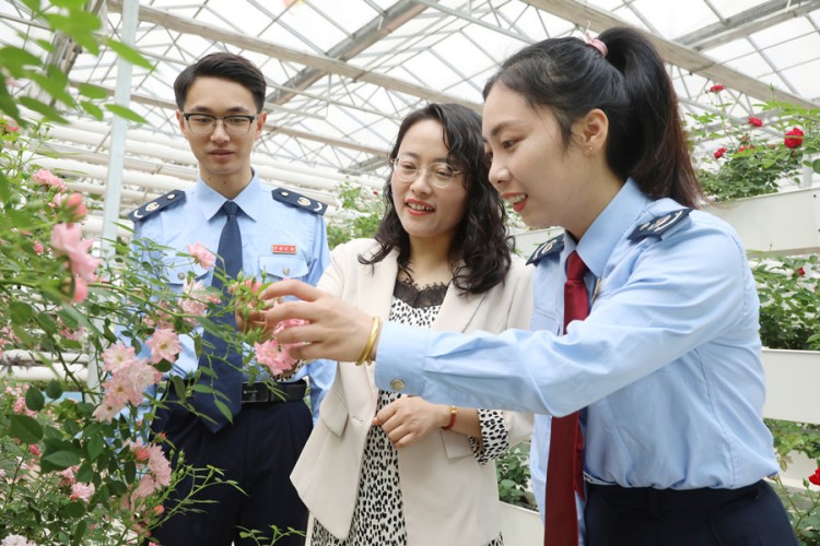 税务干部在黄山四月乡村农艺场有限公司种植基地,了解花卉生长和企业经营情况。